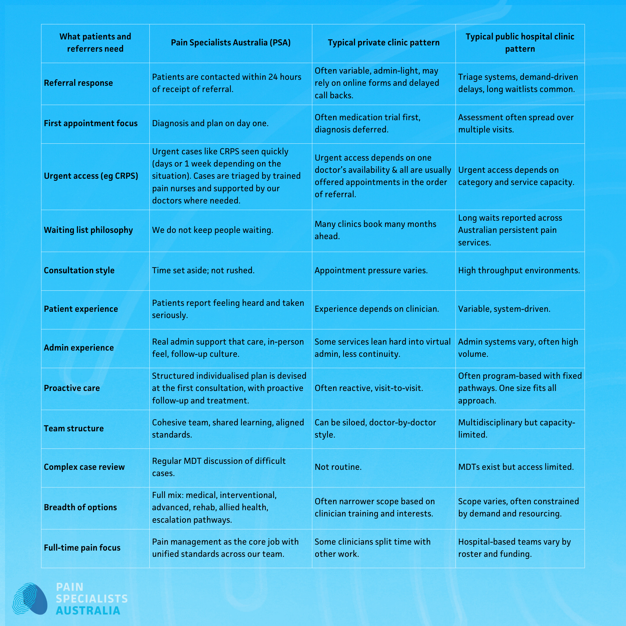 Clinics vary. The table below compares common patterns across private and public pain services with PSA’s stated model of care and service standards.
