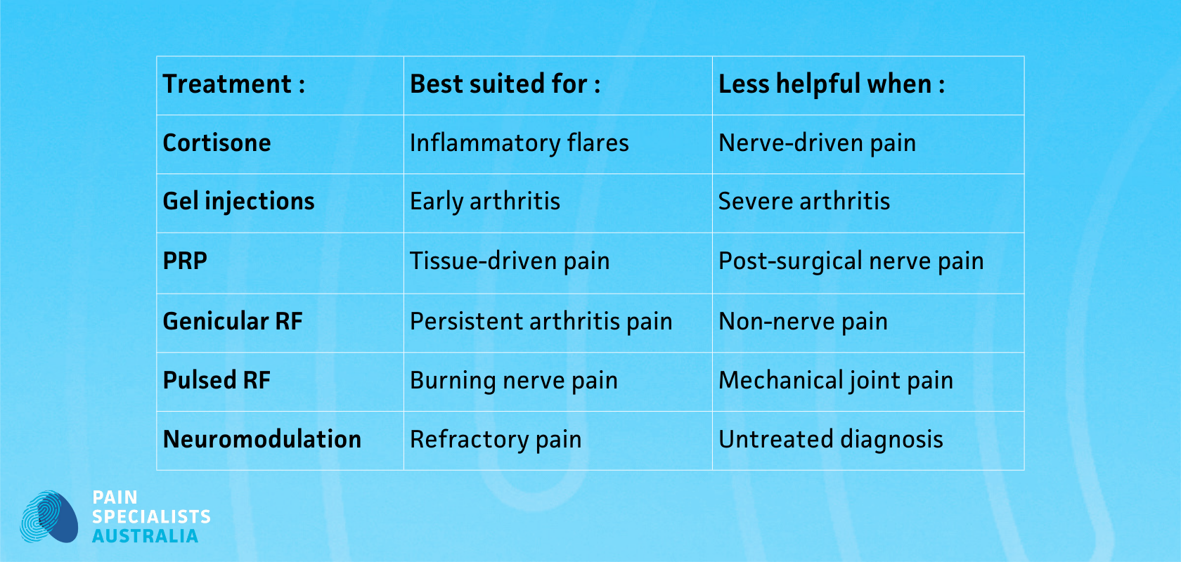 Injections and surgery treat different problems. Injections aim to reduce pain and improve function. Surgery changes joint structure. Many people use injections to delay surgery or manage pain after surgery. The right option depends on diagnosis, not scan severity alone.